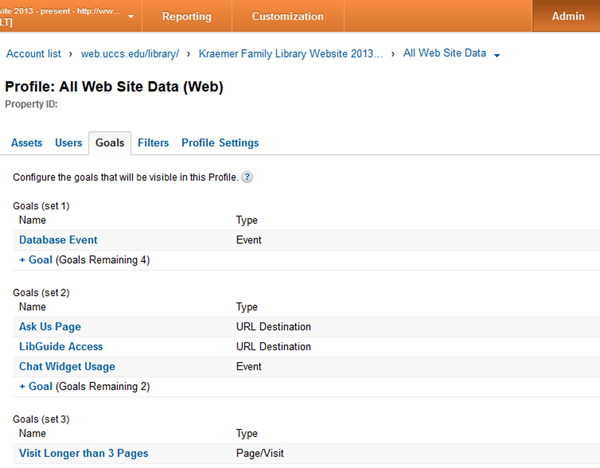 Goals tab, Google Analytics, University of Colorado Colorado Springs |