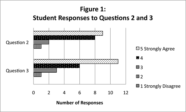 Students answered the first three questions using a scale from 1 to 5, with 1 being Strongly Disagree and 5 being Strongly Agree. These questions were: