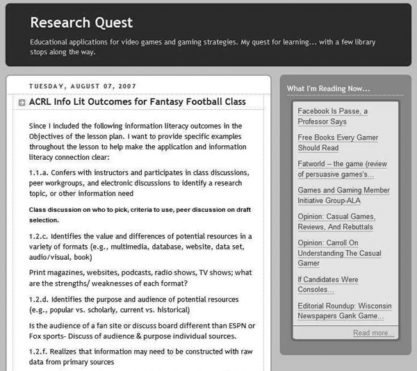 “ACRL Info Lit Outcomes for Fantasy Football Class” http://researchquest.blogspot.com/2007/08/acrl-info-lit-outcomes-for-fantasy.html