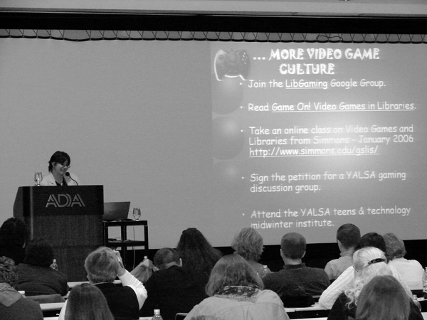 Beth Gallaway, a trainer/consultant at the Metrowest Massachusetts Regional Library System, presenting the December 2005 Gaming in Libraries Symposium, Chicago. |