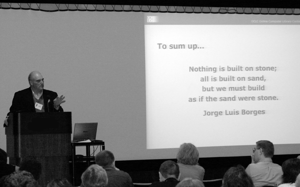 George Needham, VP at OCLC for member services, presenting at the December 2005 Gaming in Libraries Symposium, Chicago. |