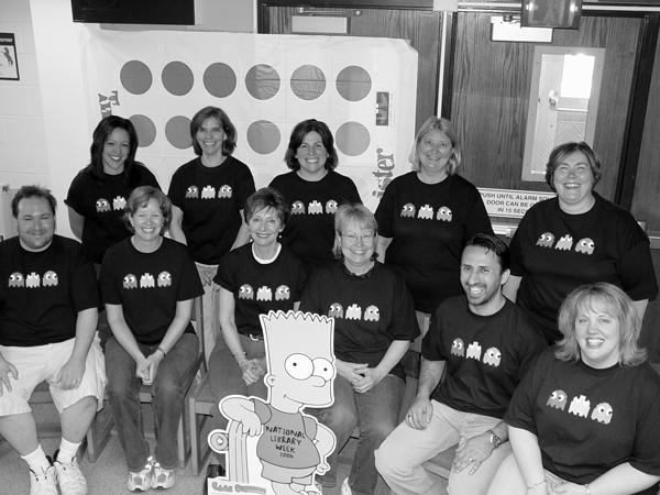 Downers Grove South High School staff members posing for pictures for the DGSHS Library National Library Week gaming event (April 2006). |