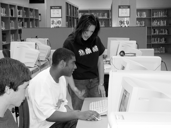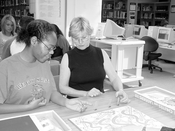 Librarian and students at the DGSHS Library's day-long gaming event at the library (April 2006). |