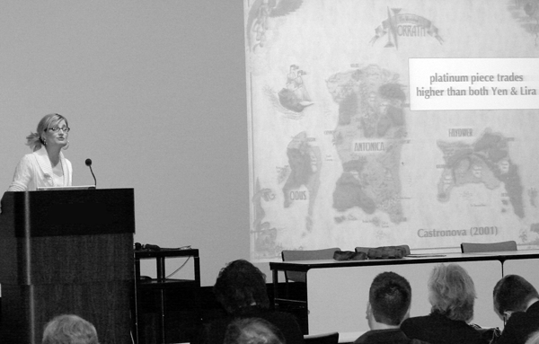 Constance Steinkuehler, from the University of Wisconsin–Madison, presenting at the 2005 Gaming in Libraries Symposium (December 5, 2005, Chicago, Illinois). |