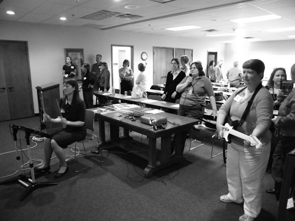 To rectify this situation and to respond to the many expressions of interest, Network Services requested that the library commission purchase some gaming equipment so that we could offer a series of workshops around the state. The equipment was purchased in January 2008, and our first day-long workshop was held on April 17, 2008: “Get Your Game On! The Why and How of Gaming in Your Library.” The whole idea was to introduce attendees to not only the why of gaming but also the how. Despite the belief that games are “so easy to set up a child can do it,” many older librarians have absolutely no experience with such equipment, and they appreciated the hands-on time.