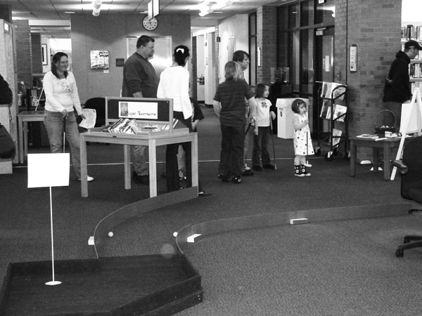 It was funny to see a number of regular library users browsing the shelves, apparently oblivious to the golf balls rolling past their heels. One long straight fairway ran about 40 feet, with the magazine lounge area on one side and a row of public computers on the other. Patrons used both areas while golfers putted up the fairway between them. Overall, I think it's great that the non–library users who came to golf got to see how heavily used the library is.