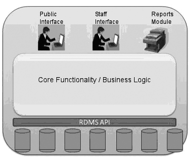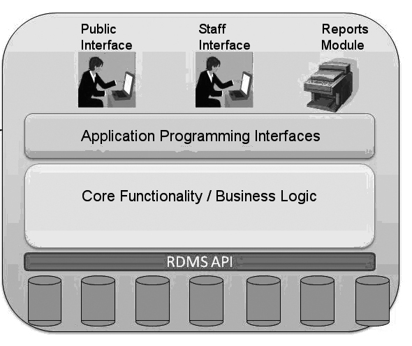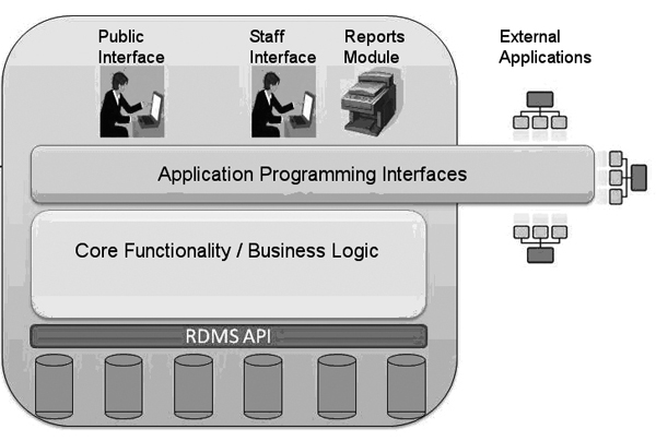 As software applications have evolved from monolithic proprietary designs to structured layered architectures, it has become common to use application programming interfaces internally. Figure 4 illustrates an ILS where the staff and public user interfaces as well as the reporting module do not access the business logic of the application through proprietary programming but only through the services made available through an application programming interface. This tiered approach has come into favor in recent years and is consistent with the service-oriented architecture. As applied internally within the application, having a presentation layer interfaces operate through a set of APIs to gain access to the underlying functionality and business logic provides many advantages, including the ability to rework user interfaces without having to reprogram the entire application.