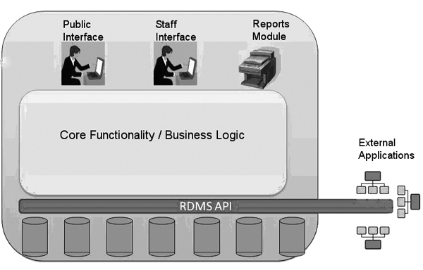 The abstraction of the database layer from the applications layer of the ILS provides a great opportunity for a library to gain access to data in ways not limited by the software provided by the vendor. As long as the software vendor provides the customer library access to the schema of the databases involved and minimal documentation, the library should be able to, at a minimum, extract data and create reports in any way needed. As shown in Figure 3, it is possible to expose the database API outside of the application itself. It's also possible to modify and add records in a database though this method. These tasks require much more care, expertise, and knowledge of the software. An ILS is a very complex business system, with many interconnections among data elements. If the library modifies data in ways that interfere with any of the higher-level software, major problems can ensue. Software vendors may restrict these database operations outside their own software that change the databases.