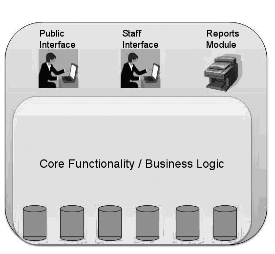 As we approach the realm of application programming interfaces, let's think of applications that lack this architecture and step our way through progressive levels of support. Figure 1 illustrates the most closed approach to programming. This type of application is completely self-enclosed. The software has exclusive access to any of the data involved. Whether the databases used are proprietary or based on standard relational database management systems (RDBMS) products, the customer has no access to them other than through the interfaces delivered as part of the software application. All of the functions of the software likewise cannot be accessed except through the interfaces delivered with the application for staff access or public access, or through a reports module.