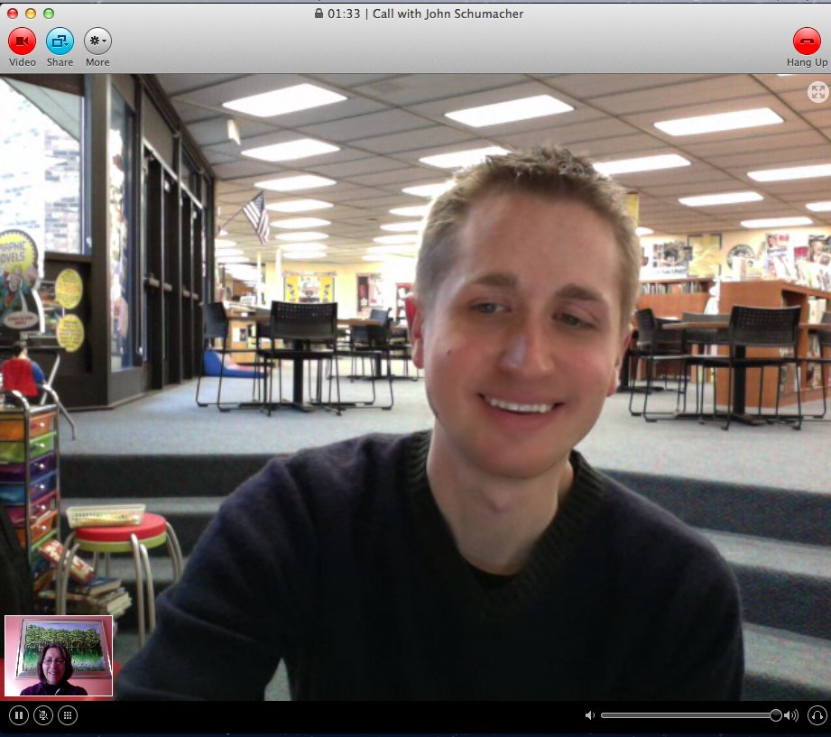 Typically, John, Shannon, and whoever else is planning to be involved make initial contact on Twitter or Skype. The ideas for projects come from various sources: a school's curriculum, John's extensive knowledge of children's literature, Shannon's love of art and illustration, or websites like Anita Silvey's Children's Book-A-Day Almanac. Once an activity is decided upon, John starts a Google Docs document to coordinate dates and times for participating librarians and their classes, with appropriate conversions for the variety of geographic locations involved. After the schedule is set, each of us adds the activity to whatever type of calendar we use. On the day of the virtual visit, all parties check in via Skype chat before the interaction with students is due to begin to make sure there will be no problem connecting that day.
