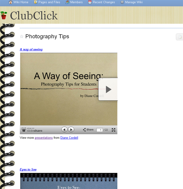 At the same time that these two young librarians were becoming an instructional team, Shannon and I decided to start a photography club, which our founding group of students named Club Click. As with John, Shannon and I are separated geographically, split between Iowa and upstate New York, but Skype makes our collaboration viable. As the lead teacher, Shannon describes the desired activity, and we set up a time to connect (always keeping in mind those pesky time zone variations). For example, at the beginning of the school year, I might use Skype's screen-sharing option to present a slideshow containing basic tips on photography to new club members. If any students have further questions or need additional information, Shannon arranges to have them Skype again during a study hall or after school. We keep Club Click resources and student photography projects on a wiki, where Shannon and some of the other librarians who have joined us, or plan to in the near future (John in Illinois, Jennifer Malphy in Wisconsin, Kathy Schmidt in Georgia, and classroom teacher Stephen Gagnon in New Hampshire), have their own pages with editing rights. Our goal with Club Click is to introduce photography as a useful skill while hopefully inspiring in some students a lifelong passion for capturing digital images. In a delightful turnabout, one of our Club Click student members copresented at a conference with Shannon and Skyped me in to describe our club and how it worked.