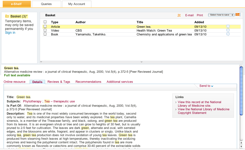 Primo offers a variety of export options that can be accessed via a variety of avenues. One avenue is through a Send To pull-down menu (figure 44) accessed from the detailed record view, or the brief record view (once a user has clicked on a link for more information), or the e-shelf shopping cart. Options include e-mailing, printing, and exporting items to citation management programs (such as EndNote or RefWorks) or social bookmarking sites (such as Connotea or Delicious). Also included is an Add to E-shelf option, which acts as a consolidated shopping cart basket (figure 45). Items can be marked—added to the e-shelf—by clicking on the star icon appearing next to each item title or by choosing the Add to E-shelf option from the Send To pull-down menu. Unauthenticated guest users can retrieve their session-based e-shelf by clicking on the My Items link at the top of the interface. The e-shelf information lists each item and includes item type, author, title, and the date on which the user added the item to the e-shelf. Highlighting an item pulls up more detailed item information. From the e-shelf, users can mark which items they wish to export and how (figure 46). Users can also review a list of session queries from the e-shelf.