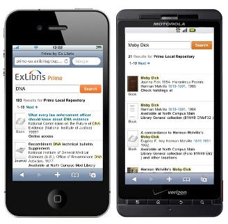 With Primo version 3, Ex Libris offers an out-of-the-box, Web-based mobile interface (figure 48) accessible on various smartphone platforms, formatting results and allowing users to search and retrieve materials, including content within the Primo Central index. Real-time status is available for catalog ILS materials. Users can also send materials from a PC-based session to a smartphone via SMS, allowing them to retrieve the materials later, away from a PC. In addition, customized mobile views of Primo have been developed by other Primo customers, such as BYU and Northwestern, and often such sites may share their work on the EL Commons community website.