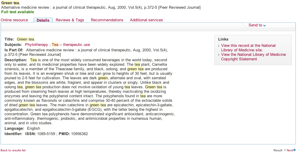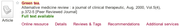 For articles (figure 40), returned information includes article title, author(s), journal title, publication date, volume and issue, page numbers, and an indication of whether the publication is a peer-reviewed journal. In addition, the user is alerted to whether the full text is available. Regardless of content type, Primo offers several options within the brief record for obtaining more detailed information. Users can click on the brief record title or on one of several links appearing at the bottom of each brief record. Libraries can configure which links are available, set the order of the links, and name the link labels; since libraries can modify Primo's cascading style sheets, other options can be provided as well. Typical links used in current Primo installations include Details, Reviews and Tags, Additional Services, and for items in the library's ILS, Locations and Holdings List. For online resources, such as e-books and articles, an Online Resource link is typically provided. Each of these links is also available in the detailed record view, should a user click on an item title directly, and are described in more detail below.