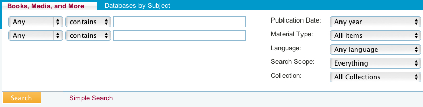 By default, Primo Central offers a single search box (figure 37). Once an initial search is executed, a returned results screen provides brief item results, detailed below. Users may also choose an advanced search option (figure 38). In both the basic and advanced search modes, users can choose particular indexes, usually presented through a pull-down menu. In a typical installation, the library may offer pull-down menus that allow the user to specify whether the record is an exact match for the terms, starts with the term, or contains the term somewhere within a specified field (such as title, author, subject, or user tag field). Advanced search also allows users to predefine parameters, such as publication date, material type, and language, or to search a particular collection or library. Such choices are defined by the local library.