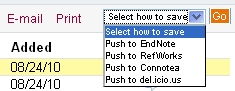 Primo Central's search box can be embedded in other online venues, such as library subject guides, course management systems, social networking sites such as a Facebook account, and so on. Primo utilizes persistent URLs, so “canned searches” with preconfigured and defined search parameters can be constructed and embedded in other webpages. As mentioned above, users can push items to social bookmarking sites, such as Delicious.
