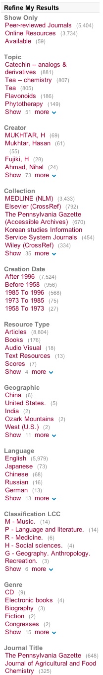 Primo Central offers faceted navigation, and in a typical configuration, facet categories display within a Refine My Results pane along the left side of the screen (figure 41). Once one or more facets are selected, a Refined By header appears at the top of the results list, along with the facets, providing a breadcrumb trail, which allows the user the option of individually undoing each facet refinement to backtrack and expand the results. By default, Primo Central includes many predefined facet categories. In addition to the out-of-the-box categories, libraries can define new facet categories. Libraries can choose which facet categories to display, customize the facet category labels, and control the order of the facet categories within the pane. A typical configuration includes a Show Only category, with choices such as Peer-Reviewed Journals, Online Resources, and Available. The Online Resources facet choice might typically include e-books, digital collections, streaming video, e-journals, and so on; the Available facet choice might include items such as e-books and physical books held at the local library. Other usual facet categories include Topic, Creator, and Collection (with choices such as a physical library collection—for example, Main Library—and Publisher Collections—for example, University of Chicago Press Journals). Additional facet categories include Creation Date (each choice providing a date range), Resource Type (books, maps, scores, etc.), LCC Classification, Genre (e.g., biography, electronic books, interviews, case studies), and Journal Title. In a typical configuration, the top five choices for each facet category will be displayed. If more choices exist for that category for a user's given search, a Show X More link provides a list of more choices. For all facet categories, the number of corresponding items matching each facet choice refinement is shown in parentheses next to the choice.