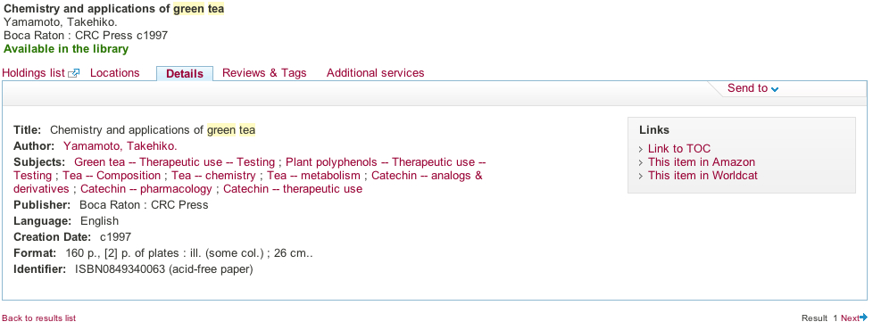 Clicking on the Details link for a physical library holding, such as a book (figure 42), provides item information, such as subjects, format, related titles, and ISBN. It also provides a description one or more sentences long, which may include summaries and table of contents. It also allows for providing contextualized links to external resources, such as Amazon and WorldCat, allowing the user to connect to these external sites for more item information; clicking on one of these external links will open up a new browser window or tab with the item-level information from that external resource. For articles and similar content (figure 43), typical information retrieved from the Details link includes title, author, subjects, journal information (title, date of publication, volume and number, page numbers, peer-review status), and language. It may also include a description one or more sentences long.