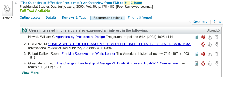 (Note: Choose the Articles + Library Holdings link. The interface is available in both Korean and English; to change to English, select English at the top right of the screen after you have conducted a search and are within the Primo Central interface. The Yonsei University site is also an example of a site that has implemented the optional bX Recommender service)