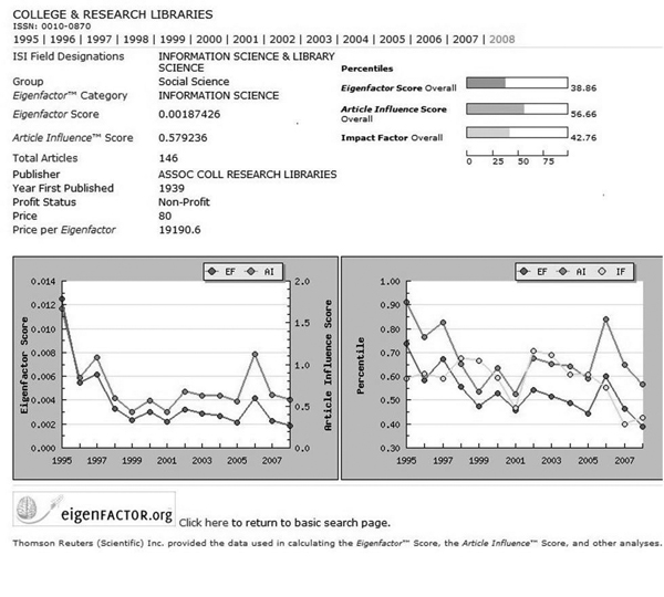 College & Research Libraries’ detailed Eigenfactor Report for 2008. In addition to providing basic information about the journal (such as publisher and first year of publication), the detailed report provides the Eigenfactor Score, the Article Influence Score, and the ISI Impact Factor. http://eigenfactor.org/detail.php?year=2008&jrlname=COLL%20RES%20LIBR&issnnum=0010-0870. |