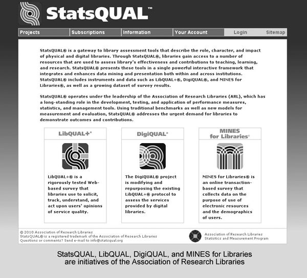 Screenshot of StatsQUAL, which is a gateway to library assessment tools that describe the role, character, and impact of physical and digital libraries. www.digiqual.org. |