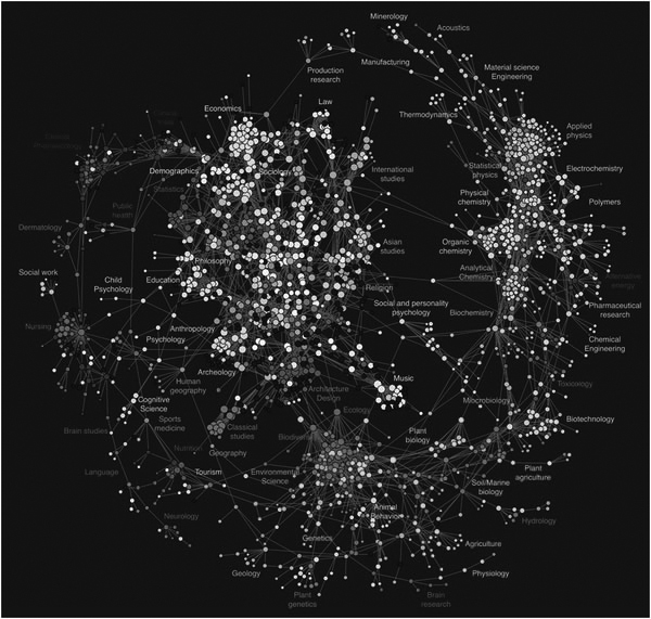 Diagram of Project MESUR's “Map of Science Derived from Clickstream Data.” Each circle represents an individual journal; colors map to subject classifications derived from the Getty Institute's Art and Architecture Thesaurus (AAT), which the the MESUR team chose to use in order to resolve discrepancies between ISI's Journal Citation Reports Classifications and Dewey Decimal Classifications. Lines between circles represent “clicks,” or searcher movement between journals (Johan Bollen, Herbert Van de Sompel, Aric Hagberg, Luis Bettencourt, Ryan Chute, Marko A. Rodriguez, and Lyudmila Balakireva, “Clickstream Data Yields High-Resolution Maps of Science,” PLoS ONE 4, no. 3, e4803 (March 11, 2009): figure 5, http://dx.doi.org/10.1371/journal.pone.0004803 [accessed June 22, 2010]). Johan Bollen, MESUR principal investigator, had this to say about the map in a June 6, 2010, e-mail conversation with the authors: “Users behave in ways that may diverge quite strongly from preconceptions of what they ‘should’ do. Our maps demonstrate this phenomenon quite clearly…. If users believe mathematics (as a domain) is closer to statistics and other social sciences than it is to physics, then that belief will be manifested in their usage and thus your usage data. When you organize your resources or services, the question then becomes: will you do so according to what *you* think should be or what your users are actually telling you?” |