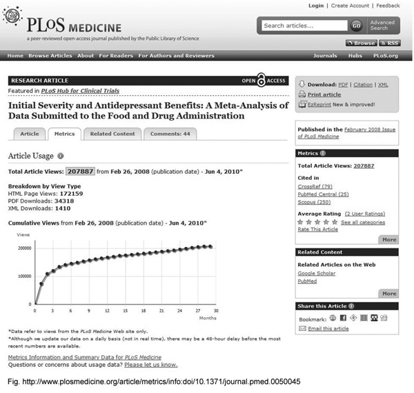 Screenshot of an article from PLoSMedicine showing article-level metrics including page views, downloads, citations, and ratings by readers. |