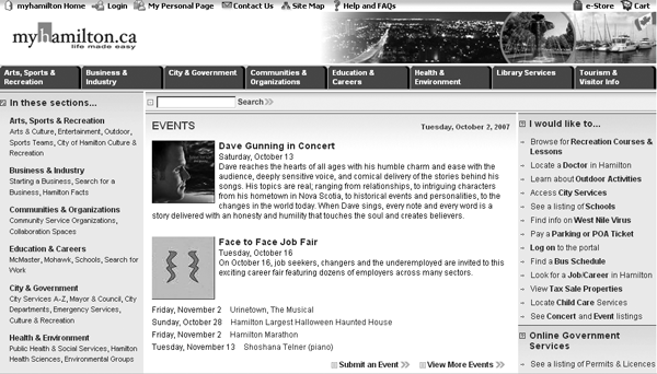 MyHamilton is a community portal for Hamilton, Ontario. Several local organizations, including Hamilton Public Library and McMaster University Library, are involved in this project. The project started in June 2001 when local support was rallied, user needs were assessed, and the technology options for portals were examined. In July 2003, Hamilton was awarded the funds needed to build the community portal. With funding secured, MyHamilton issued a request for proposals for vendors interested in building the portal needed, and the vendors began work in April 2004.