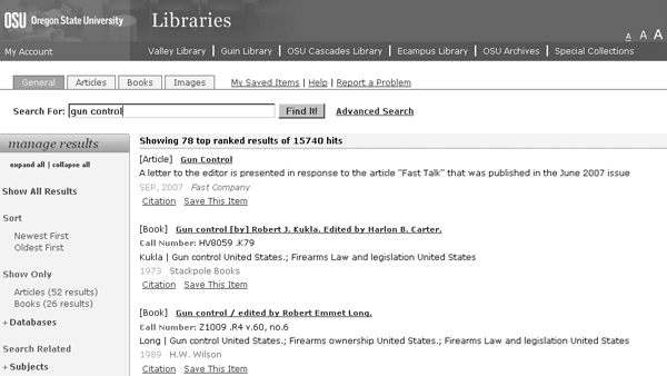 The results screen for a search for “gun control” in LibraryFind at OSU. |
