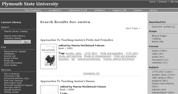 Screenshot of the top results from a search for “Austen” from the Lampson Library at Plymouth State University, which runs Scriblio. |