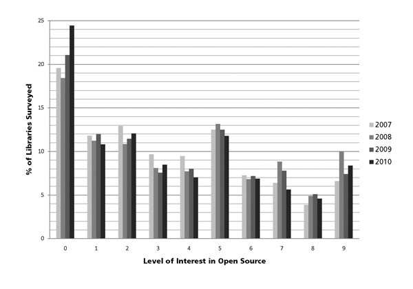 Thus the overall picture in 2010 is of low, even zero, interest in open source, but with a notable and diverse population of highly interested libraries. How has this picture changed over time? Figure 13 shows the percent of respondents expressing any given level of interest in open source products from 2007 through 2010.