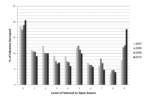 To summarize, the overall picture of open source interest is conflicted, and data can be found to support (or undermine) many hypotheses. One might look at the low average interest in open source, and the high number of respondents expressing zero interest, and conclude that these products will not be broadly adopted. One could look at the increasing levels of high interest in open source products, coupled with the elevated likelihood that highly interested libraries will switch to open source, and conclude that we are at the threshold of an explosion—or, considering the comments and the impact of libraries that have already gone open source, conclude that interested libraries with high technical knowledge have already switched, and the rest may be frustrated. Indeed, the same question might appear to have different answers depending on whether one looks at means, modes, medians, or distributions; 2010 alone, or trends over time. Readers are cautioned against drawing conclusions beyond the scope of the data.