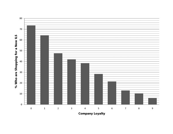 Percentage of libraries shopping for a new ILS versus company loyalty. |