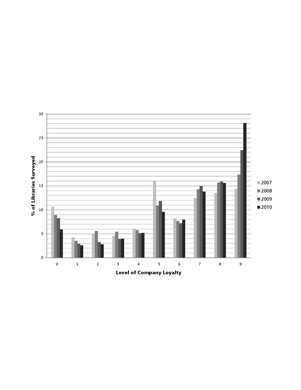 In comparison with these relatively flat lines, it is interesting to look at company loyalty over time. In Figure 23 we see the percent of libraries expressing each level of company loyalty, 0–9.
