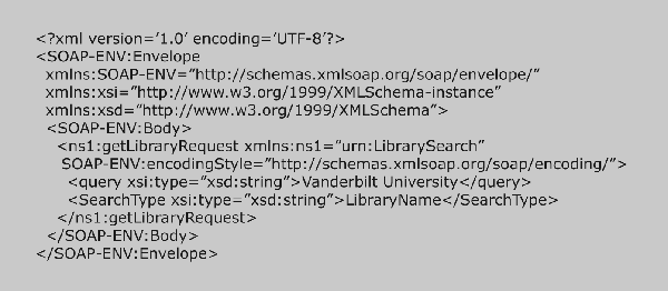Fundamentally, SOAP is a protocol for transmitting messages, and of course, those messages will be formulated in XML. In practical terms, SOAP specifies how to construct the XML document that represents the message carrying the request and response. The current version, SOAP 1.2, relies extensively on XML schemas. The crucial role for SOAP lies in wrapping the requests and responses according to the specification. Figure 3 provides an example of a Web-service request created as a SOAP message.