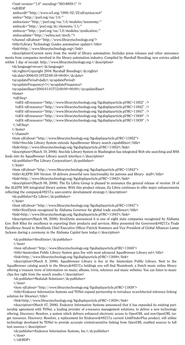 The Library Technology Guides Web site includes an RSS feed that you can view as an example of a RESTful Web service. The feed on this site can be invoked with the URL www.librarytechnology.org/rss/rss.pl.