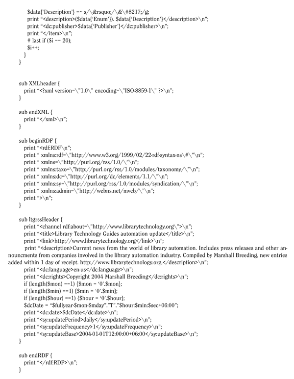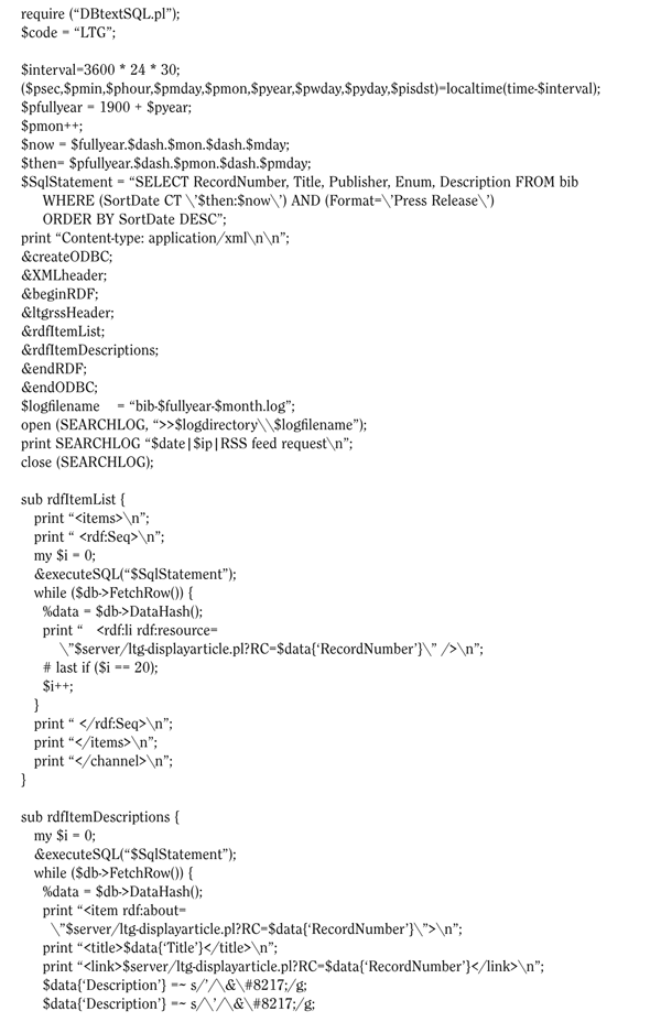 The Perl script that dynamically generates the XML document for the RSS feed is displayed in appendix 2.