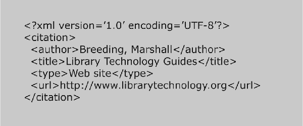 The code in figure 2 (below) illustrates a very simple XML document. It does not follow any specific schema or DTD, but simply provides a citation using XML syntax. Notice that the document begins with a header that describes the version of XML it uses and the character set, or encoding, used for all data within the document. One of the trickiest aspects of XML involves making sure that all data adheres to the encoding rules established. Special characters and punctuation marks often need to be converted to an acceptable form, lest the XML document be invalid and be rejected by the parser.
