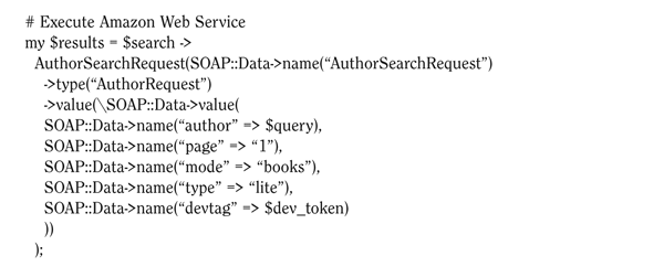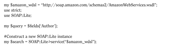 The next section shows how the code sets things up to begin using SOAP, which will issue the request and receive the response. Perl::Lite supports WSDL, so it simply points to the AmazonWebService.wsdl file that defines the service and lets it do all the work of informing the client about the data types, messages, methods, and bindings that comprise the service.