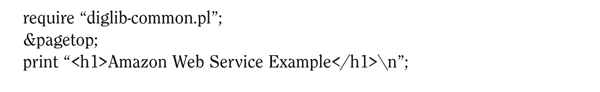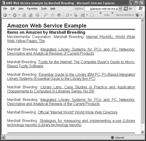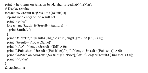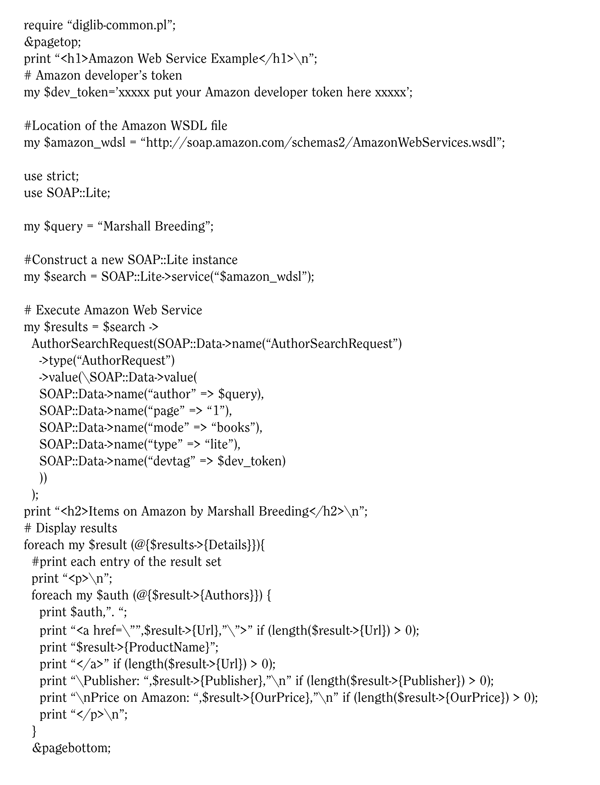 This script resides in a directory on the server that's configured to execute CGI-style programs. The value of the author to search is passed on as a parameter in the URL: www.family-photos.info/amazon-web-service .pl?Author=Marshall%20Breeding. When a Web browser invokes this script, it produces the Web page shown in appendix 4.