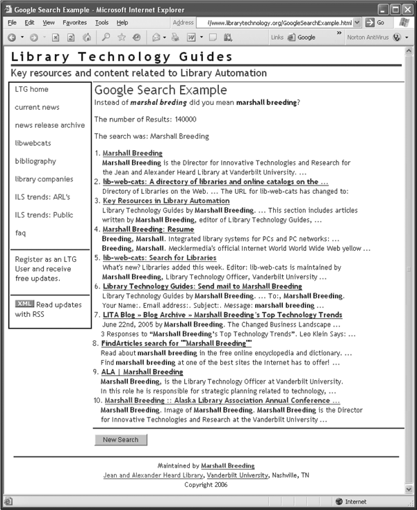 This simple example illustrates how one can draw information from a given resource and display that information in an interface. Although Amazon.com certainly looks much better than the simplistic interface demonstrated, the point is that the user is now able to use the content returned in whatever form his or her application might need. The script in appendix 3 builds a Web page that displays content from just the one source, but a more interesting example might involve using Web services from multiple sources. This is often called a mashup.
