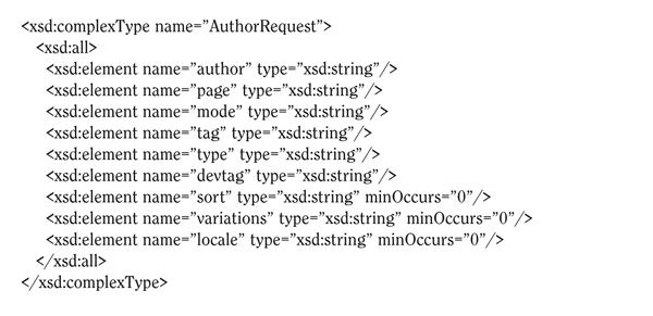 The AuthorRequest method in the Perl script corresponds to the way the AuthorRequest data type has been defined in the WSDL (appendix 8).