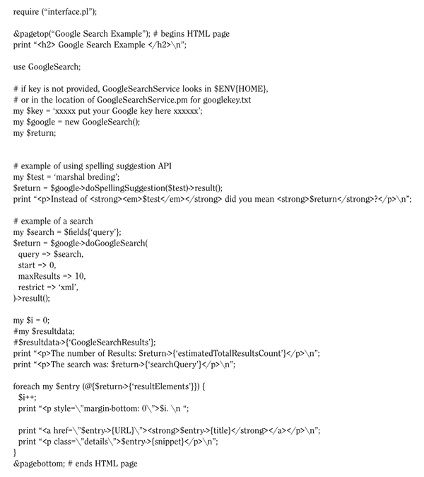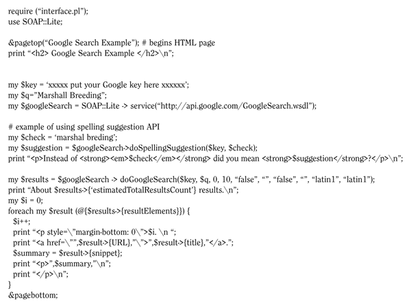 ActiveState offers the Perl module GoogleSearch .pm, which implements a SOAP interface to the methods available in the Google API. Appendix 10 is based on the ActiveState GoogleSearch.pm module. The GoogleSearch pm does not use the WSDL; rather the methods and data structures known to exist in the API have been hard coded into the module, yet there are many similarities to the Amazon search examples.