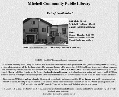 Some library websites are still operating under that older, more traditional model of Web design and structure (see figure 2). There's no online collection on the website. No meetings, chat, or other types of interaction happen online. There is rarely a staff person or staff group whose main job is to oversee the site. There certainly aren't “digital branch workers,” which we'll discuss later. The traditional library website exists primarily to guide people to the physical building and to the services that can be found inside the library.