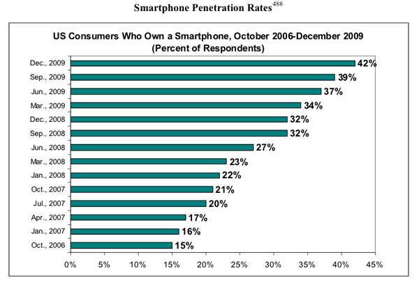 The FCC reported that at the end of 2009, 42 percent of consumers owned a smartphone.7 According to the FCC, smartphones accounted for 44 percent of total mobile phone sales in 2009, and for 50 percent of phone upgrades.8 The FCC's definition of a smartphone is restrictive, however, as it counts over 228 million active mobile devices capable of receiving data service, and over 202 million active devices capable of browsing the Web.9 Over 35 percent of U.S. adults now own phones upon which they can install software applications, according to Pew. That number does not include devices like the iPad or iPod Touch, which can use apps, but which don't function as a traditional cell phone.10
