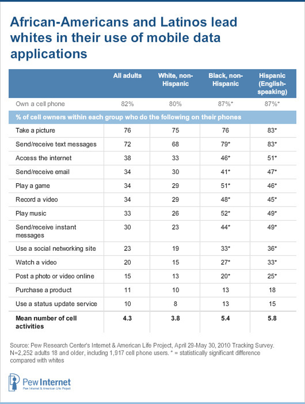 The report Mobile Access 2010 from the Pew Internet and American Life Project notes that Latino and Black adults are more likely both to own mobile devices and to use them to access the Internet than their White peers (figure 8). While 80 percent of white adults own mobile phones, among African Americans and English-speaking Latinos the rate of ownership is 87 percent. Of all American adults with cell phones, 38 percent use them to access the Internet, but black and English-speaking Hispanic users far outstrip the average, at 46 percent and 51 percent respectively. Pew's survey did not have a Spanish-language option, so data on Spanish-speaking Latinos was not available.21
