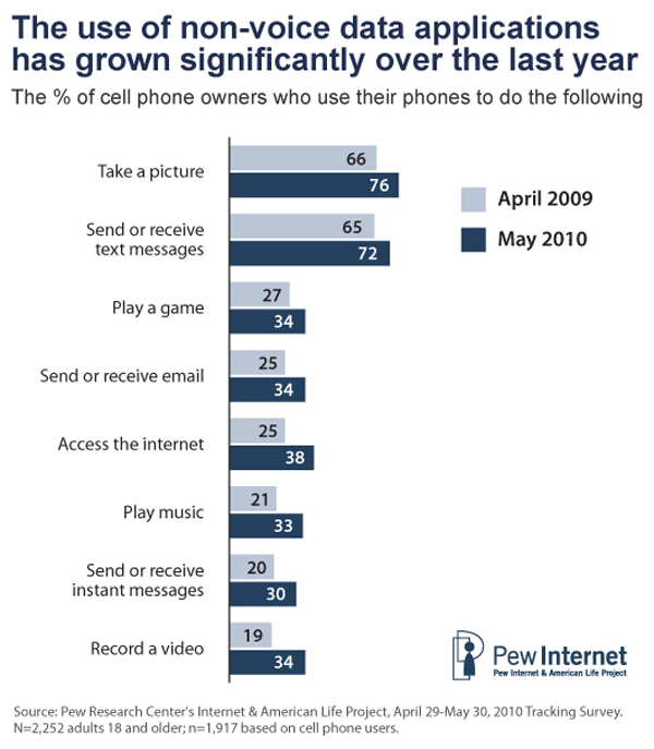 Users are taking advantage of the nonvoice connectivity provided by the current generation of mobile devices (figure 6). The Pew Internet and American Life project tells us that in 2010, 40 percent of adults in the United States report using their phone for Internet access, to send or receive e-mail, or for instant messaging. In 2009, that number was 32 percent.12 A significant majority of young adults access the Internet from their phones, a full 65 percent according to Pew.13 A comScore press release reported that just over 30 percent of American cell phone owners age 13 and older used their device's web browser in an average month in early 2010.14