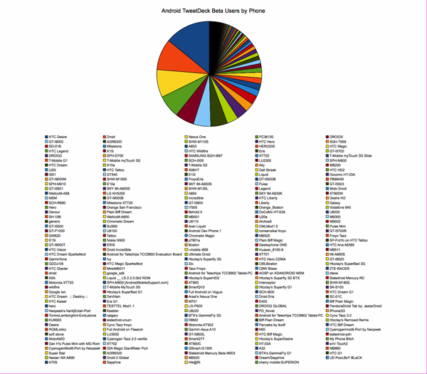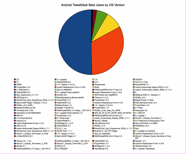 Likewise, because of Android's liberal software license, it's not necessarily even appropriate to speak of it as a single platform. Handset manufacturers like HTC and Motorola, as well as carriers like Verizon, have been shipping handsets with versions of Android so highly customized that they are incompatible with future updates to the Android OS, which instead have to be similarly customized before being shipped to users. The same survey by TweetDeck found over 100 different variations on the Android OS were running on their users’ phones (figure 17).9 While a significant majority were using recent mainline Android releases (2.2 and 2.1), a still-significant number were using outdated or splinter versions of the OS that would likely be incompatible with applications developed for the current Android release.