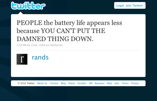 A valid point regarding battery life in today's devices (Source: rands, July 22, 2008, http://twitter.com/#!/rands/status/865671906 [accessed Jan. 4, 2011]). |