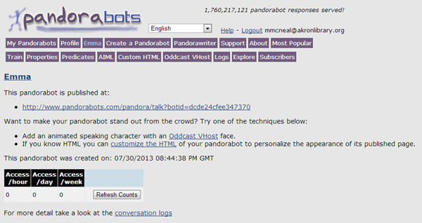 Program O is an open-source, web-based application written in PHP using a MySQL database. You can access and download Program O from the Program O website. Older versions of Program O lacked some of the functionality of Program Z, but this gap has been greatly reduced with the release of version 2.0. Program O has the same advantages and disadvantages as program Z; you will have to set up the engine on your own server and will need to have PHP and MySQL running on that server. A good knowledge of PHP and MySQL is helpful, but not entirely necessary. As you will be installing Program O on your own webspace, it is more complicated than using Pandorabots, but can offer greater flexibility for experienced webmasters. The University of Nebraska’s Pixel is an excellent example of a library bot written in Program O; Morti is another well-written Program O chatbot.